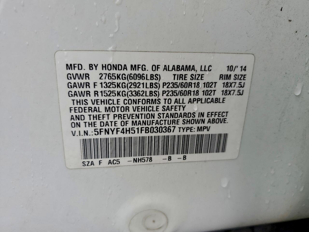 2015 HONDA PILOT 2015 року Бензин, 3.5, Повний привід, vin - 5FNYF4H51FB030367 з США