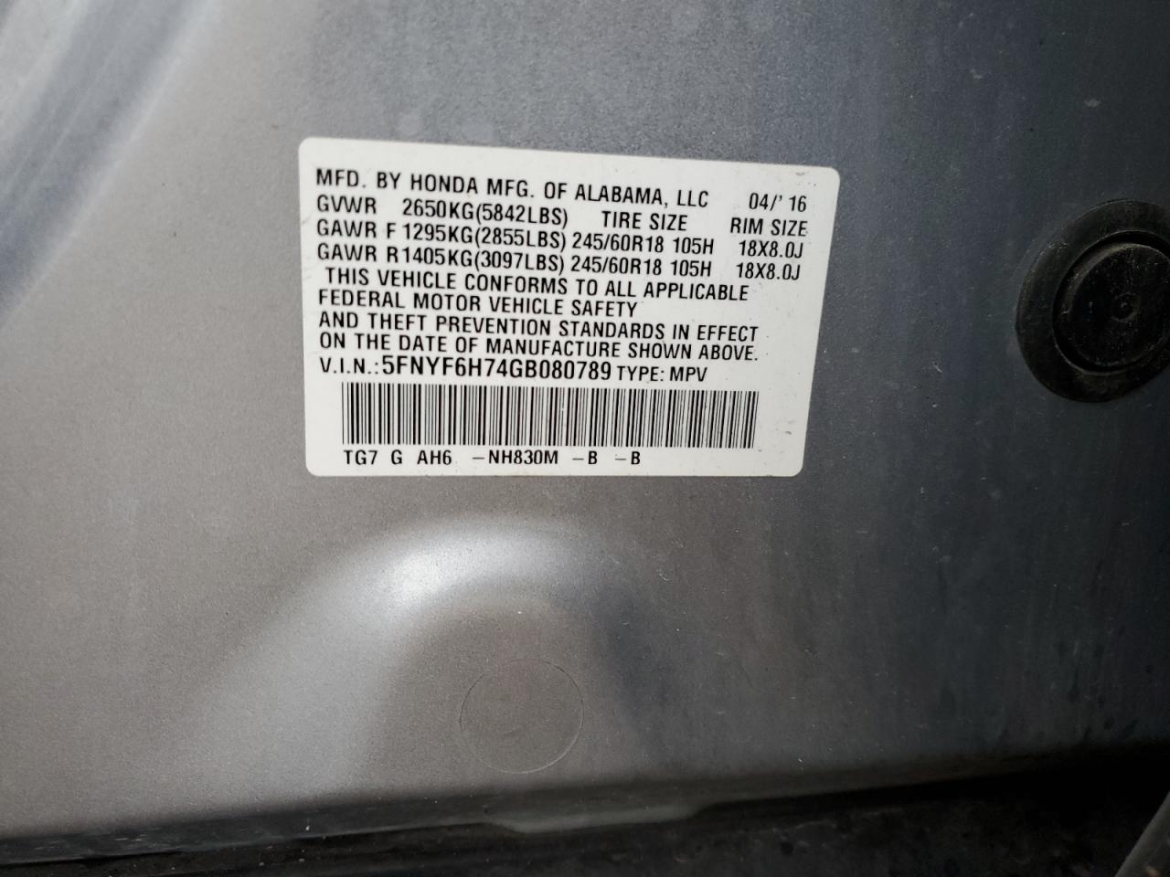 2016 HONDA PILOT 2016 року Бензин, 3.5, Повний привід, vin - 5FNYF6H74GB080789 з США