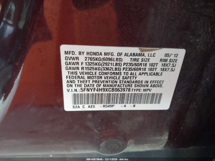 2012 HONDA PILOT 2012 року Бензин, 3.5, Повний привід, vin - 5FNYF4H9XC8063978 з США