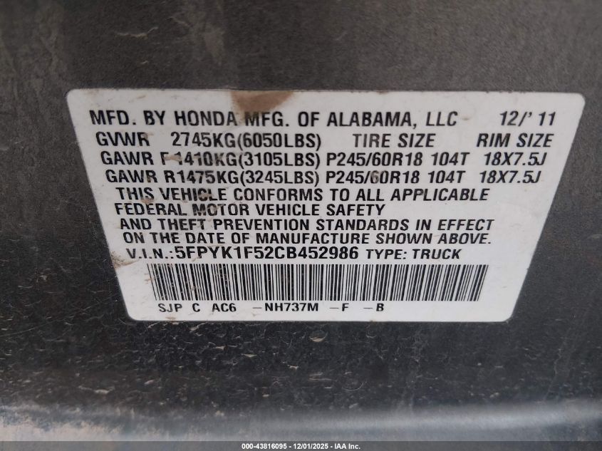Колір СірийЦиліндри 6Привід Повний привідVIN 5FPYK1F52CB452986Стан Заводиться та їде (перевірено)Ушкодження Ліва сторона AutoRIA