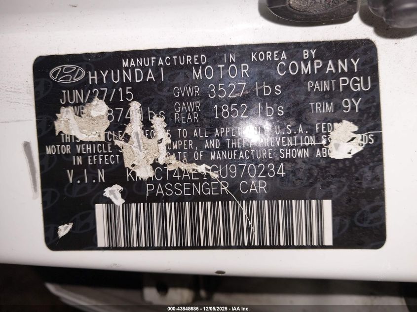 2016 HYUNDAI ACCENT 2016 року Бензин, 1.6, Передній привід, vin - KMHCT4AE1GU970234 з США