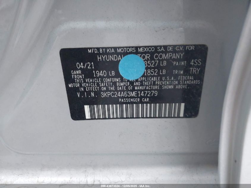 2021 HYUNDAI ACCENT 2021 року Бензин, 1.6, Передній привід, vin - 3KPC24A63ME147279 з США