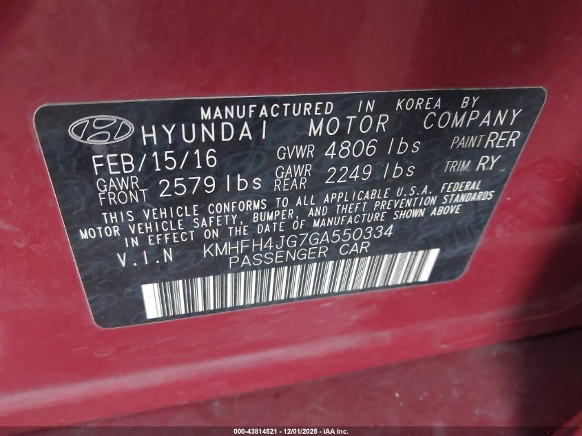 2016 HYUNDAI AZERA 2016 року Бензин, 3.3, Передній привід, vin - KMHFH4JG7GA550334 з США