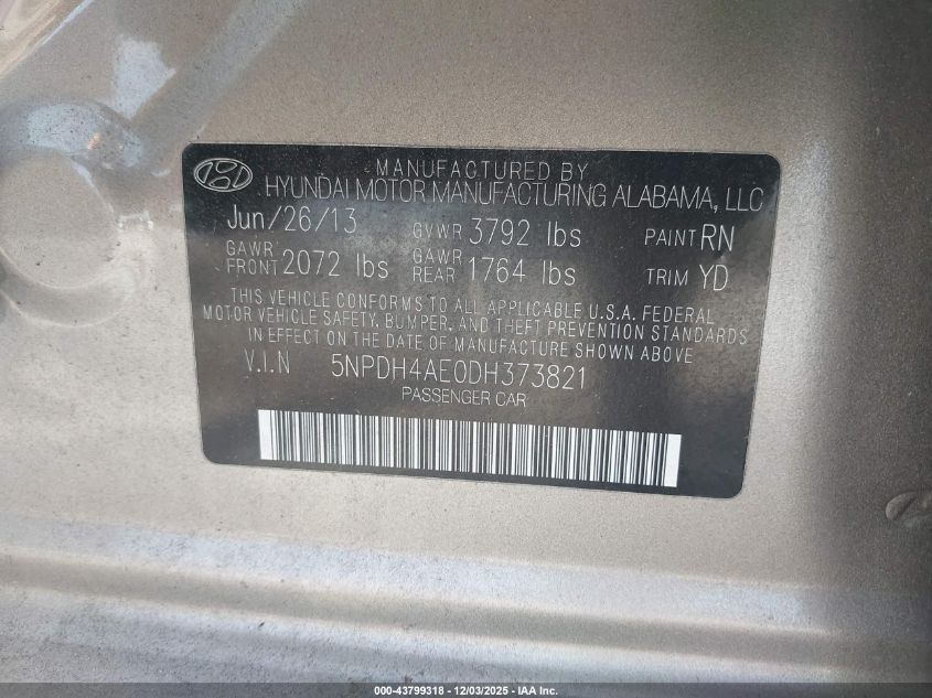 2013 HYUNDAI ELANTRA 2013 року Бензин, 1.8, Передній привід, vin - 5NPDH4AE0DH373821 з США