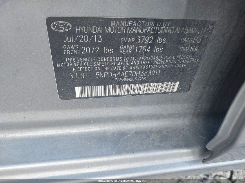 2013 HYUNDAI ELANTRA 2013 року Бензин, 1.8, Передній привід, vin - 5NPDH4AE7DH383911 з США