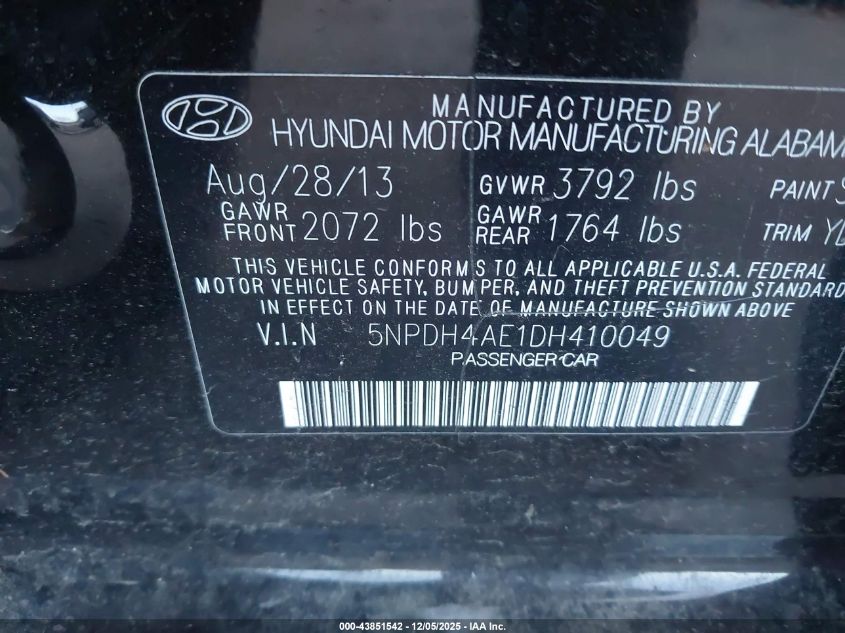 2013 HYUNDAI ELANTRA 2013 року Бензин, 1.8, Передній привід, vin - 5NPDH4AE1DH410049 з США
