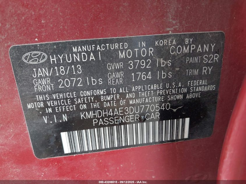 2013 HYUNDAI ELANTRA 2013 року Бензин, 1.8, Передній привід, vin - KMHDH4AE3DU770540 з США
