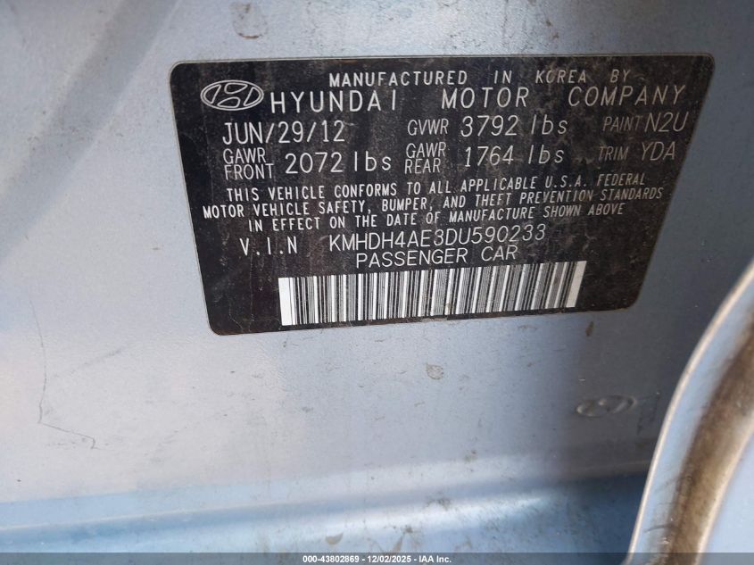 2013 HYUNDAI ELANTRA 2013 року Бензин, 1.8, Передній привід, vin - KMHDH4AE3DU590233 з США