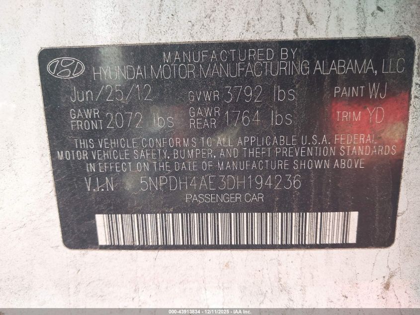 2013 HYUNDAI ELANTRA 2013 року Бензин, 1.8, Передній привід, vin - 5NPDH4AE3DH194236 з США