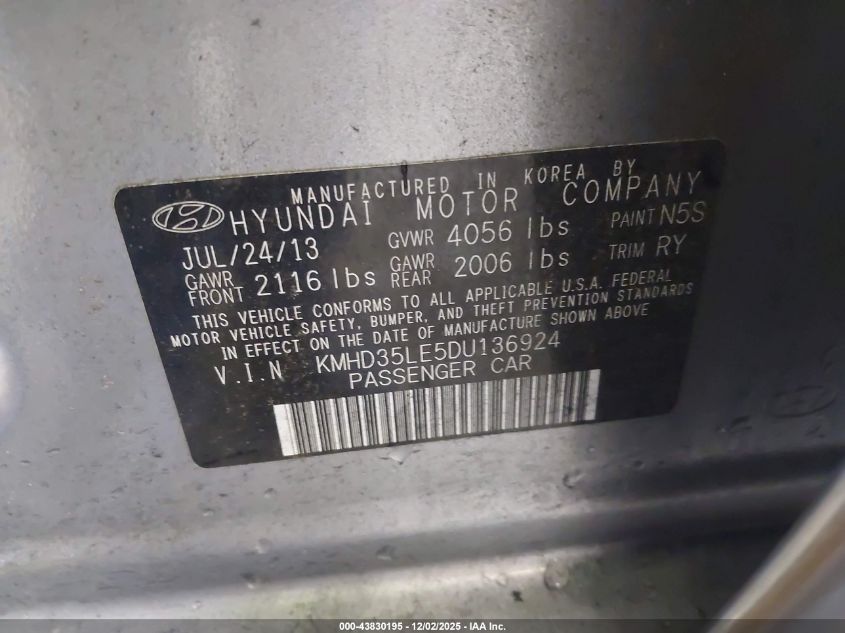 2013 HYUNDAI ELANTRA 2013 року Бензин, 1.8, Передній привід, vin - KMHD35LE5DU136924 з США