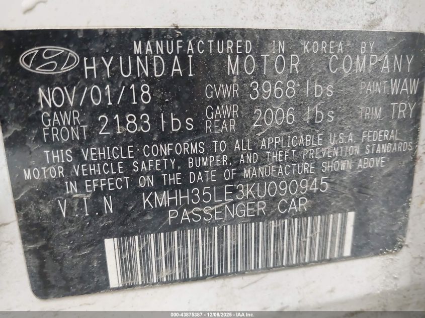 2019 HYUNDAI ELANTRA 2019 року Бензин, 2.0, Передній привід, vin - KMHH35LE3KU090945 з США