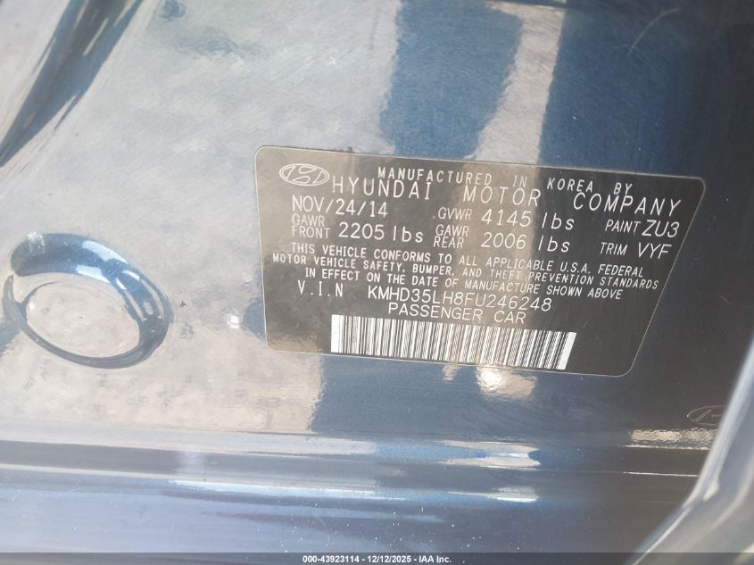 2015 HYUNDAI ELANTRA 2015 року Бензин, 2.0, Передній привід, vin - KMHD35LH8FU246248 з США