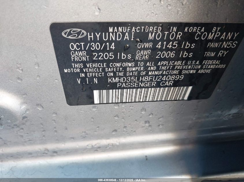 2015 HYUNDAI ELANTRA 2015 року Бензин, 2.0, Передній привід, vin - KMHD35LH8FU240899 з США