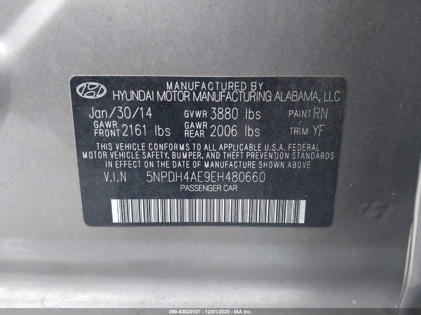 2014 HYUNDAI ELANTRA 2014 року Бензин, 1.8, Передній привід, vin - 5NPDH4AE9EH480660 з США