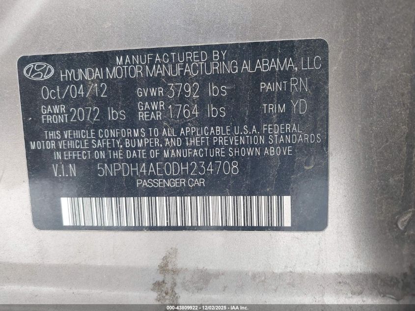 2013 HYUNDAI ELANTRA 2013 року Бензин, 1.8, Передній привід, vin - 5NPDH4AE0DH234708 з США
