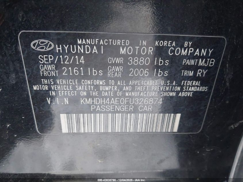 2015 HYUNDAI ELANTRA 2015 року Бензин, 1.8, Передній привід, vin - KMHDH4AE0FU326874 з США