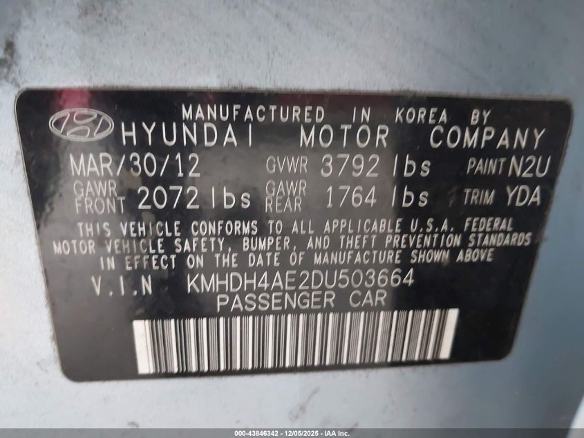 2013 HYUNDAI ELANTRA 2013 року Бензин, 1.8, Передній привід, vin - KMHDH4AE2DU503664 з США
