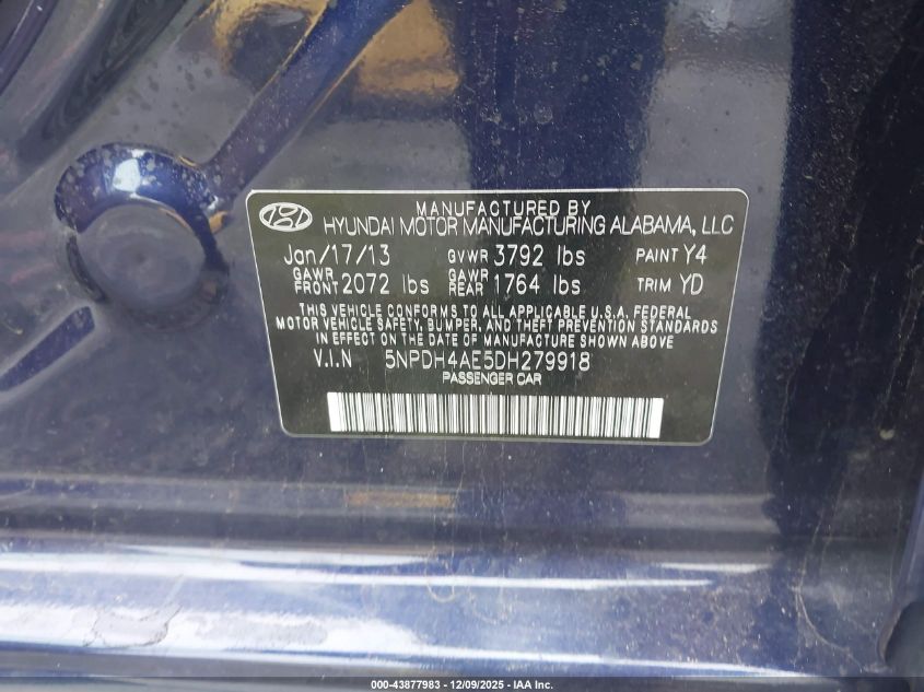 2013 HYUNDAI ELANTRA 2013 року Бензин, 1.8, Передній привід, vin - 5NPDH4AE5DH279918 з США