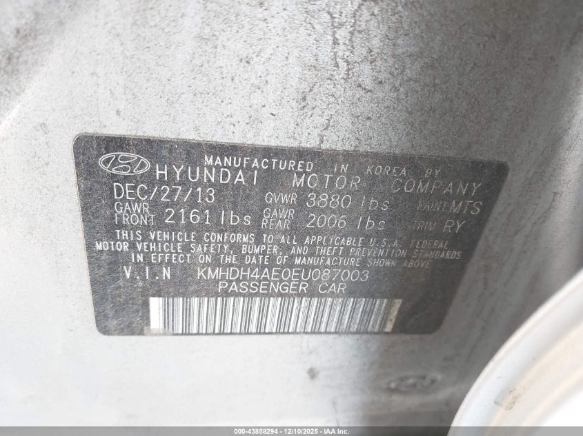 2014 HYUNDAI ELANTRA 2014 року Бензин, 1.8, Передній привід, vin - KMHDH4AE0EU087003 з США