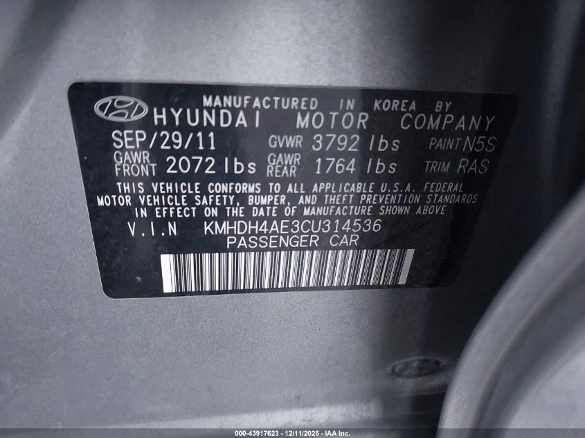 2012 HYUNDAI ELANTRA 2012 року Бензин, 1.8, Передній привід, vin - KMHDH4AE3CU314536 з США
