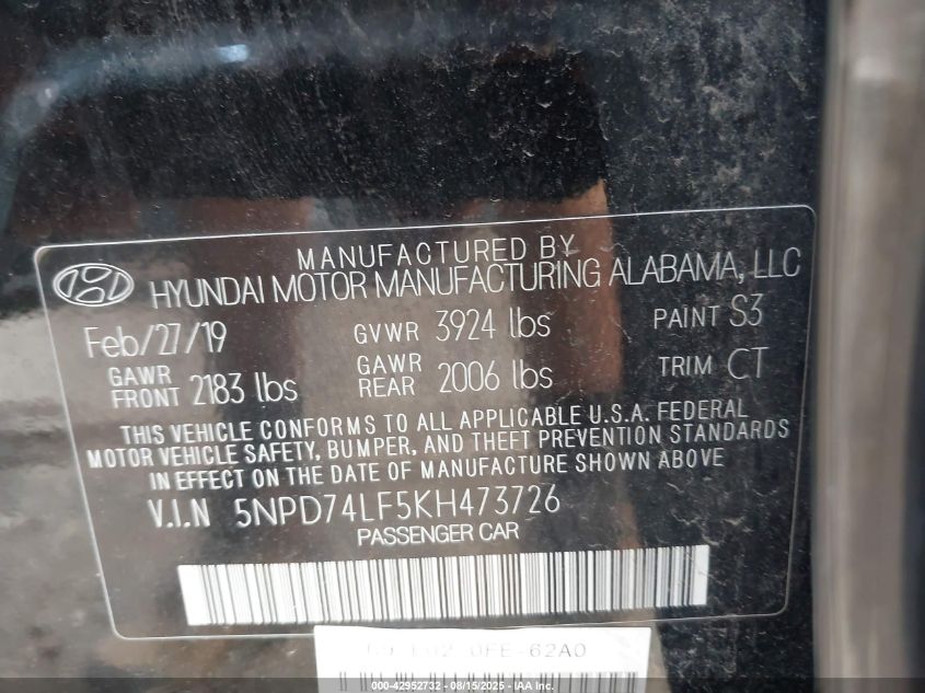 2019 HYUNDAI ELANTRA 2019 року Бензин, 2.0, Передній привід, vin - 5NPD74LF5KH473726 з США