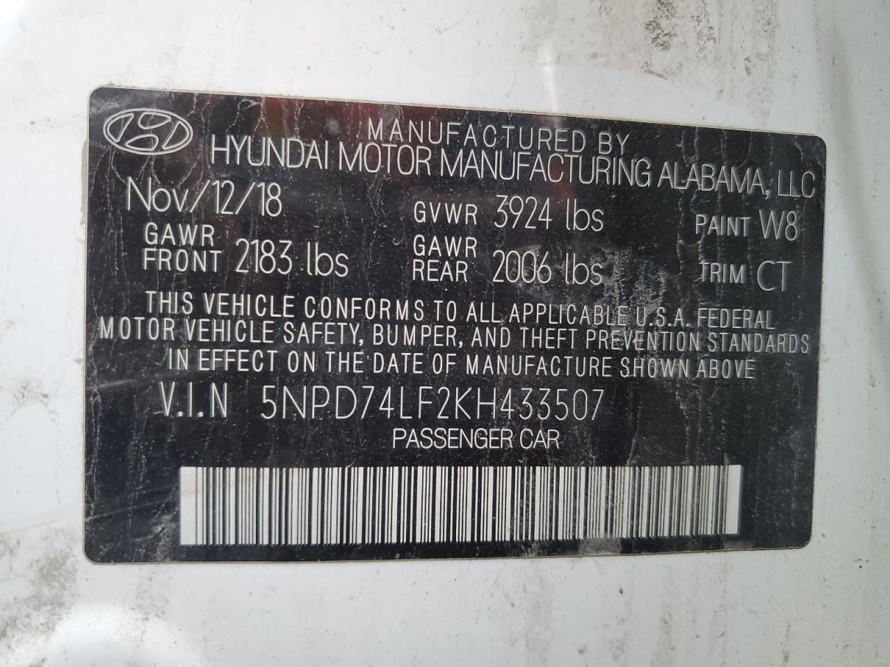 Колір БілийЦиліндри 4VIN 5NPD74LF2KH433507Стан Заводиться та їде (перевірено)Ушкодження Передня або задняДата аукціону 2025-12-08 AutoRIA
