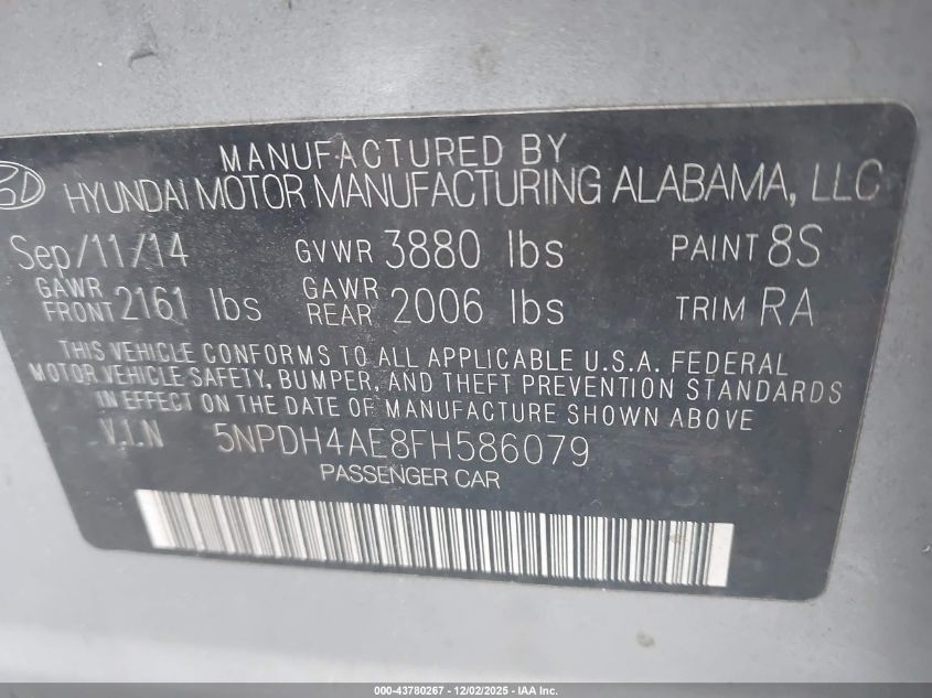 2015 HYUNDAI ELANTRA 2015 року Бензин, 1.8, Передній привід, vin - 5NPDH4AE8FH586079 з США