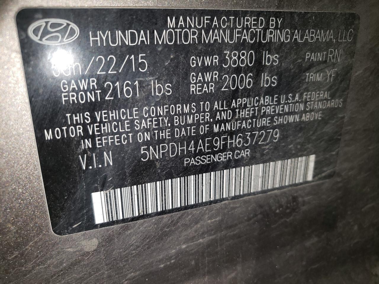 2015 HYUNDAI ELANTRA 2015 року Бензин, 1.8, , vin - 5NPDH4AE9FH637279 з США