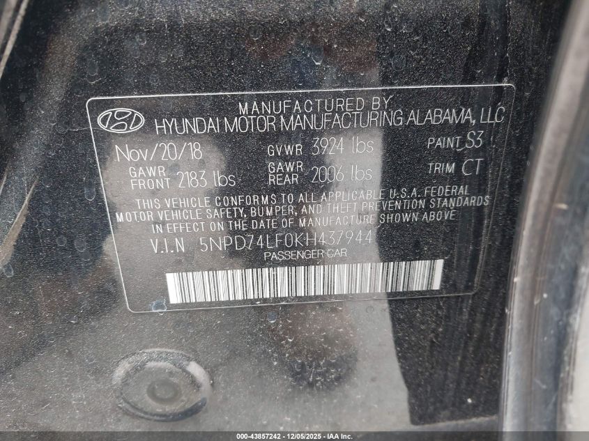 2019 HYUNDAI ELANTRA 2019 року Бензин, 2.0, Передній привід, vin - 5NPD74LF0KH437944 з США