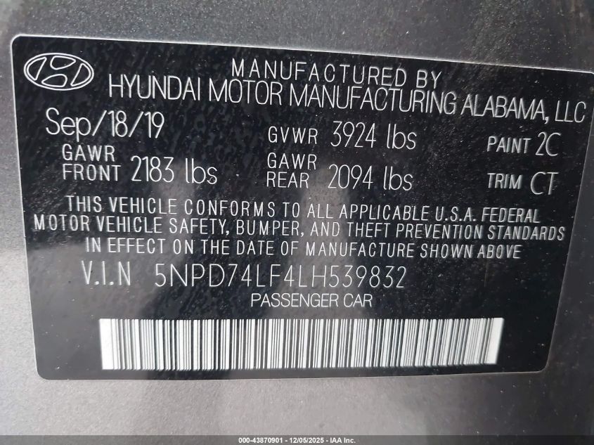 2020 HYUNDAI ELANTRA 2020 року Бензин, 2.0, Передній привід, vin - 5NPD74LF4LH539832 з США