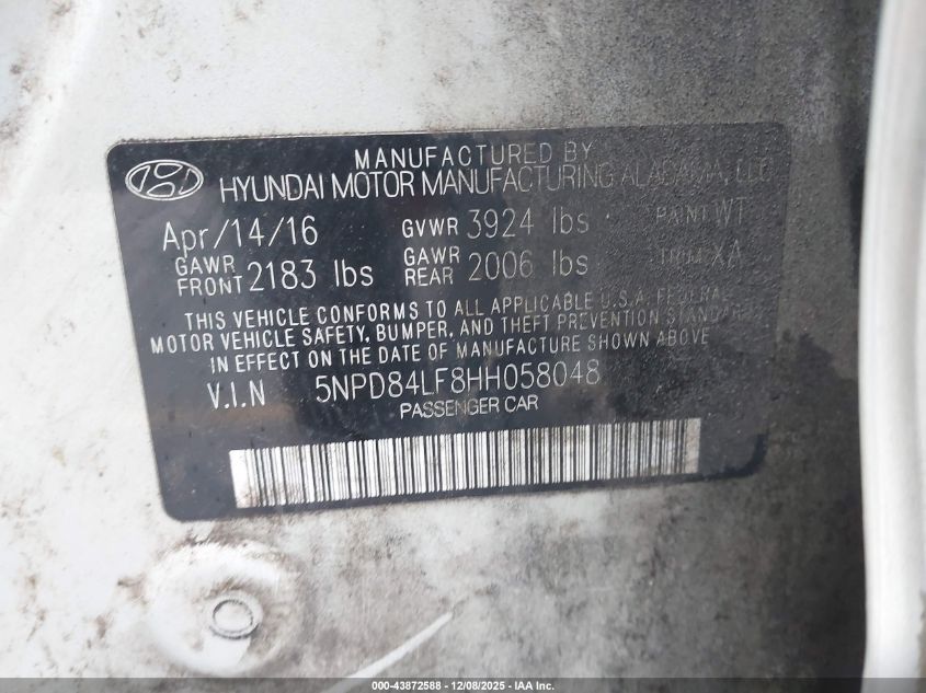 2017 HYUNDAI ELANTRA 2017 року Бензин, 2.0, Передній привід, vin - 5NPD84LF8HH058048 з США