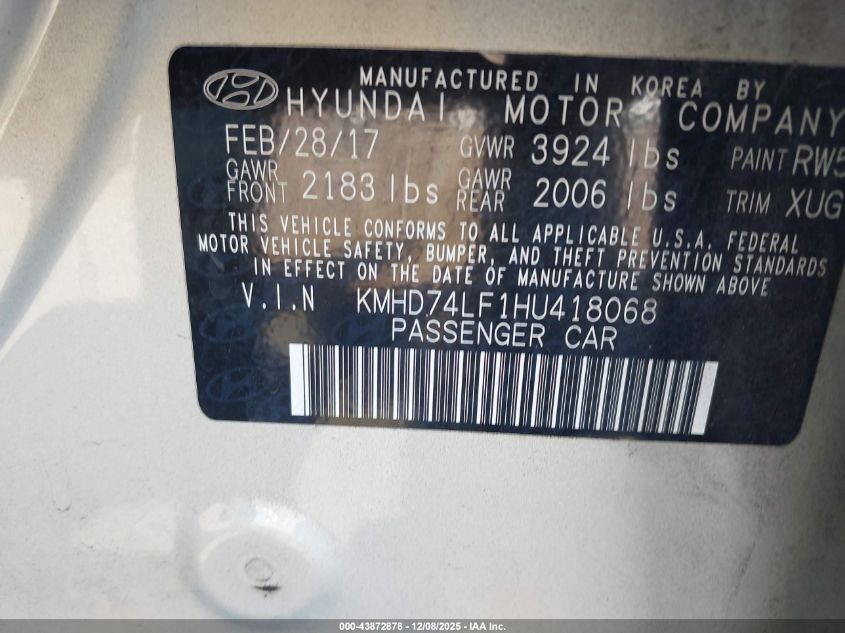 2017 HYUNDAI ELANTRA 2017 року Бензин, 2.0, Передній привід, vin - KMHD74LF1HU418068 з США