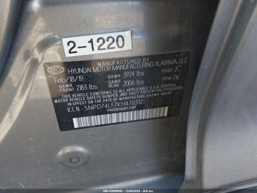 2019 HYUNDAI ELANTRA 2019 року Бензин, 2.0, Передній привід, vin - 5NPD74LF7KH470312 з США