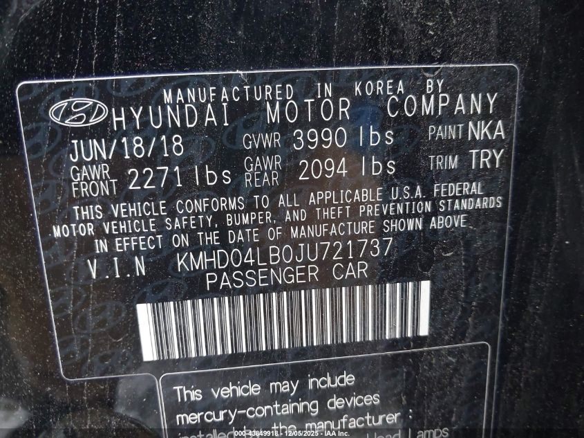 2018 HYUNDAI ELANTRA 2018 року Бензин, 1.6, Передній привід, vin - KMHD04LB0JU721737 з США