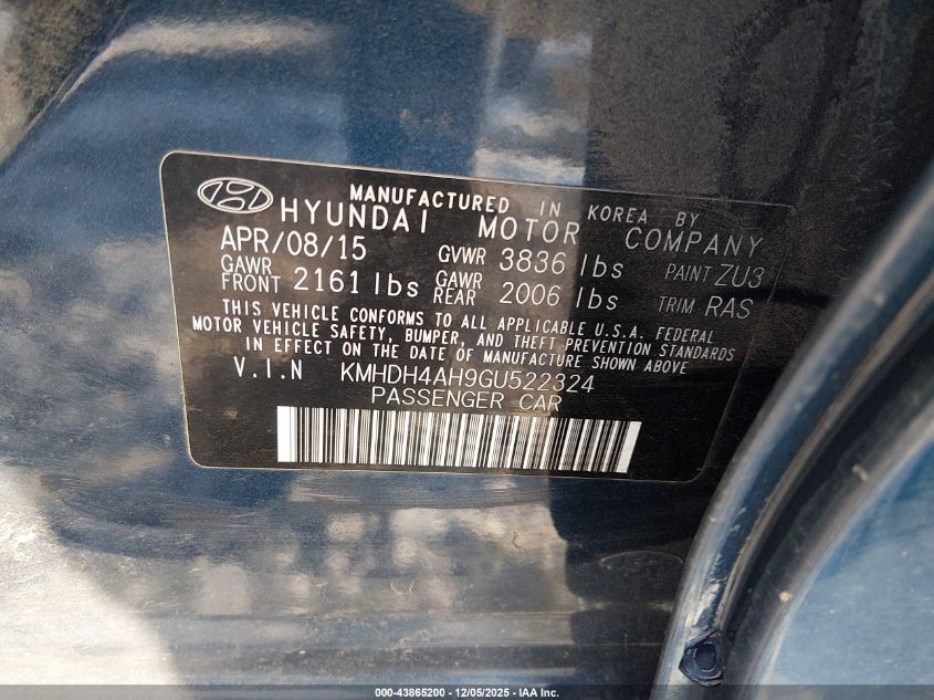 2016 HYUNDAI ELANTRA 2016 року Бензин, 2.0, Передній привід, vin - KMHDH4AH9GU522324 з США