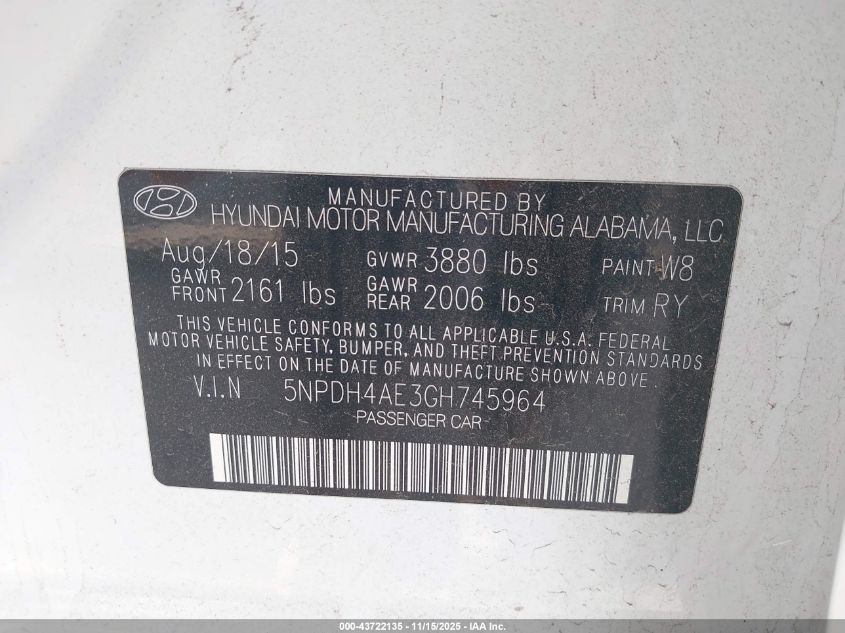 2016 HYUNDAI ELANTRA 2016 року Бензин, 1.8, Передній привід, vin - 5NPDH4AE3GH745964 з США