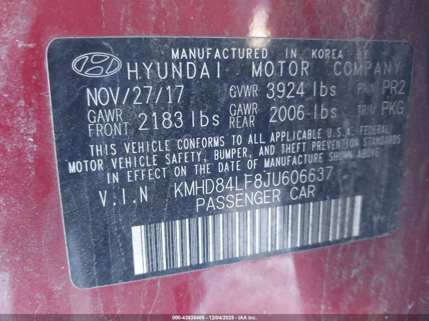 2018 HYUNDAI ELANTRA 2018 року Бензин, 2.0, Передній привід, vin - KMHD84LF8JU606637 з США