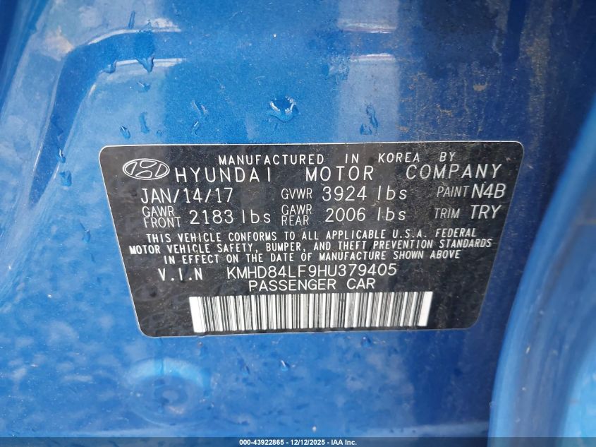 2017 HYUNDAI ELANTRA 2017 року Бензин, 2.0, Передній привід, vin - KMHD84LF9HU379405 з США