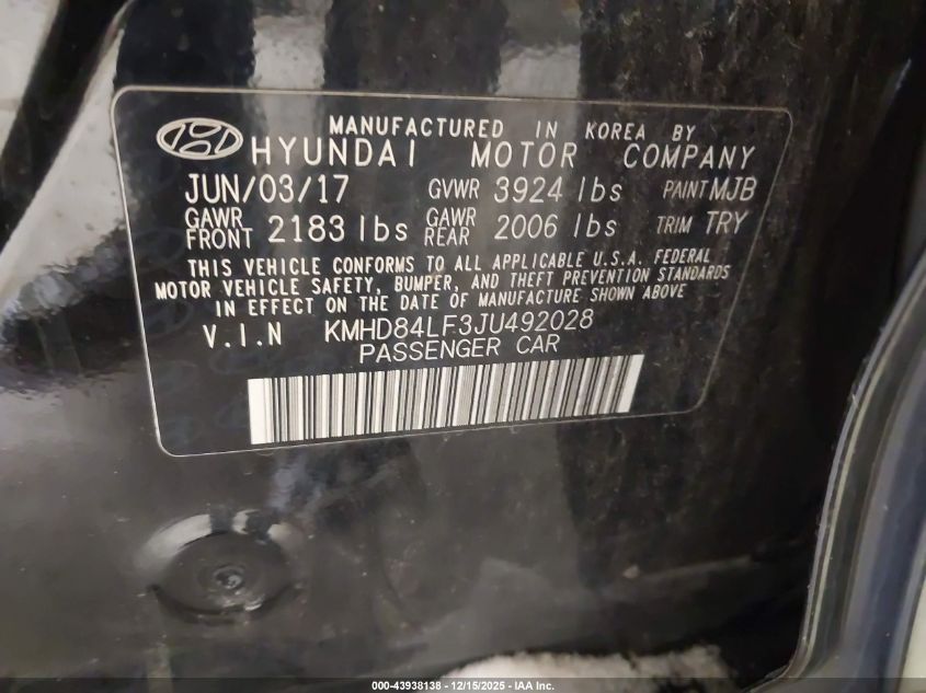 2018 HYUNDAI ELANTRA 2018 року Бензин, 2.0, Передній привід, vin - KMHD84LF3JU492028 з США
