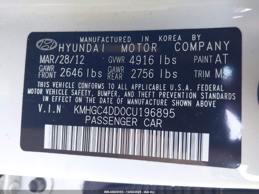 2012 HYUNDAI GENESIS 2012 року Бензин, 3.8, Задній привід, vin - KMHGC4DD0CU196895 з США