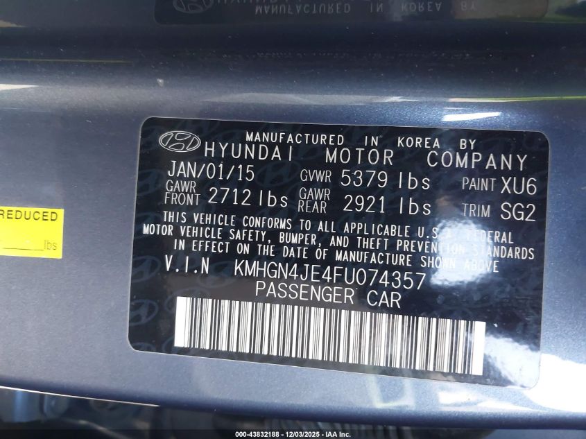 2015 HYUNDAI GENESIS 2015 року Бензин, 3.8, Задній привід, vin - KMHGN4JE4FU074357 з США