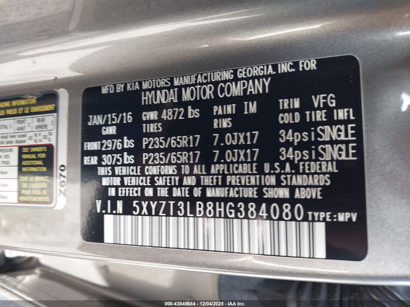 2017 HYUNDAI SANTA FE 2017 року Бензин, 2.4, Передній привід, vin - 5XYZT3LB8HG384080 з США