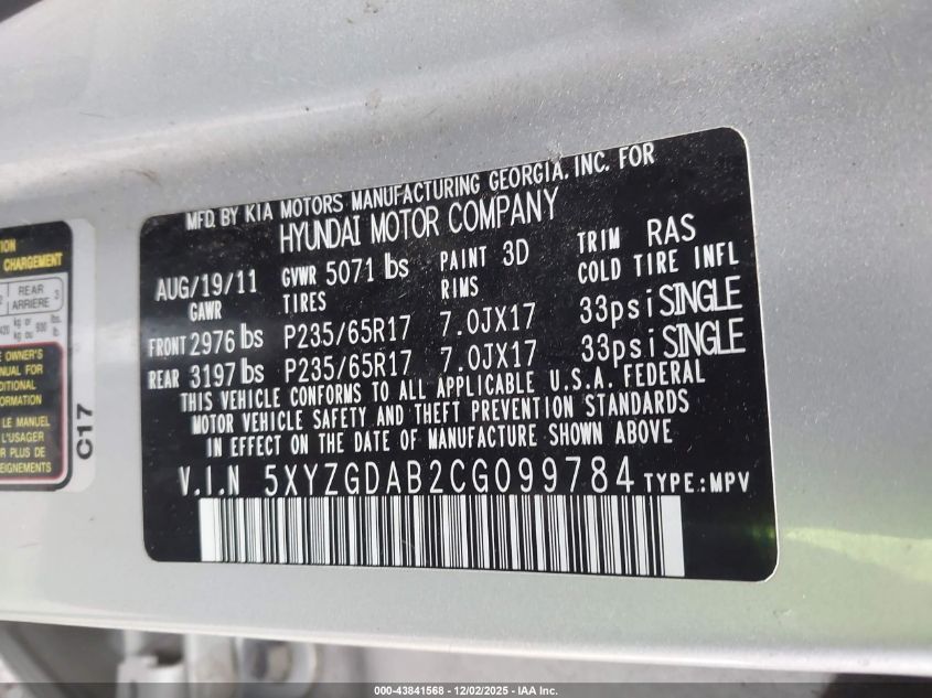 2012 HYUNDAI SANTA FE 2012 року Бензин, 2.4, Повний привід, vin - 5XYZGDAB2CG099784 з США