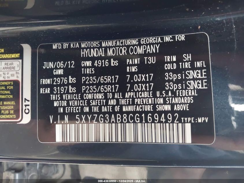 2012 HYUNDAI SANTA FE 2012 року Бензин, 2.4, Передній привід, vin - 5XYZG3AB8CG169492 з США