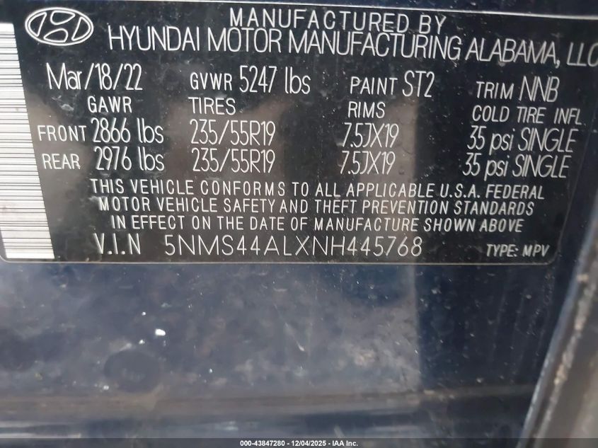 2022 HYUNDAI SANTA FE 2022 року Бензин, 2.5, Передній привід, vin - 5NMS44ALXNH445768 з США