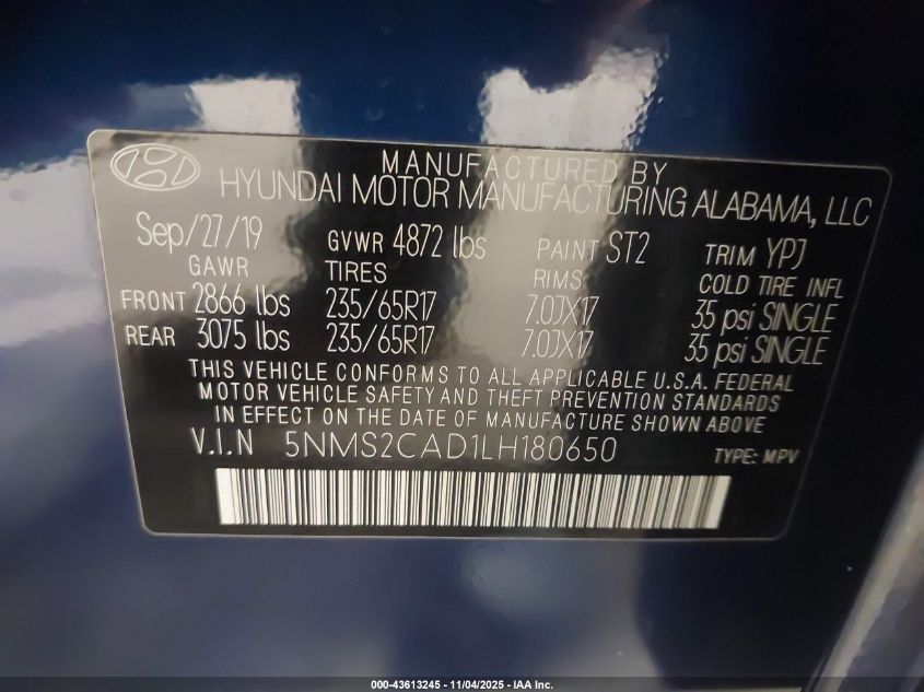 2020 HYUNDAI SANTA FE 2020 року Бензин, 2.4, Повний привід, vin - 5NMS2CAD1LH180650 з США