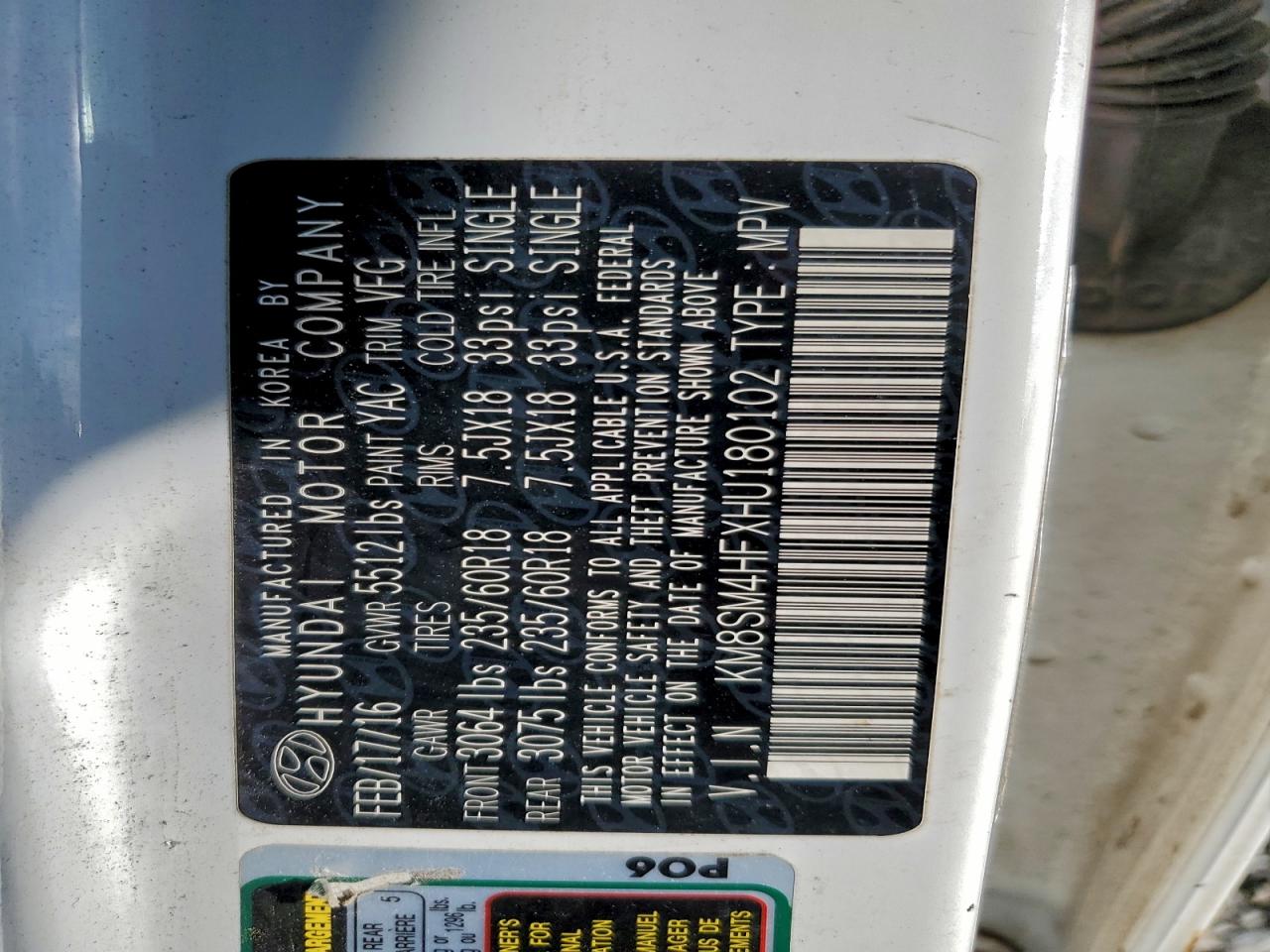 Колір БілийЦиліндри 6VIN KM8SM4HFXHU180102Стан НевідомоУшкодження Механічні пошкодженняДата аукціону 2025-12-08 AutoRIA