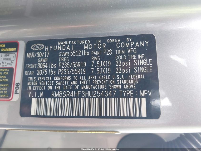 2017 HYUNDAI SANTA FE 2017 року Бензин, 3.3, Передній привід, vin - KM8SR4HF3HU254347 з США