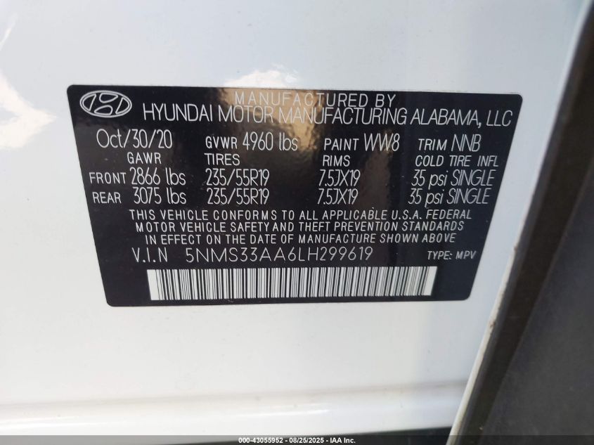 2020 HYUNDAI SANTA FE 2020 року Бензин, 2.0, Передній привід, vin - 5NMS33AA6LH299619 з США