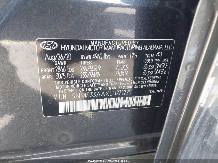 2020 HYUNDAI SANTA FE 2020 року Бензин, 2.0, Передній привід, vin - 5NMS33AAXLH271225 з США